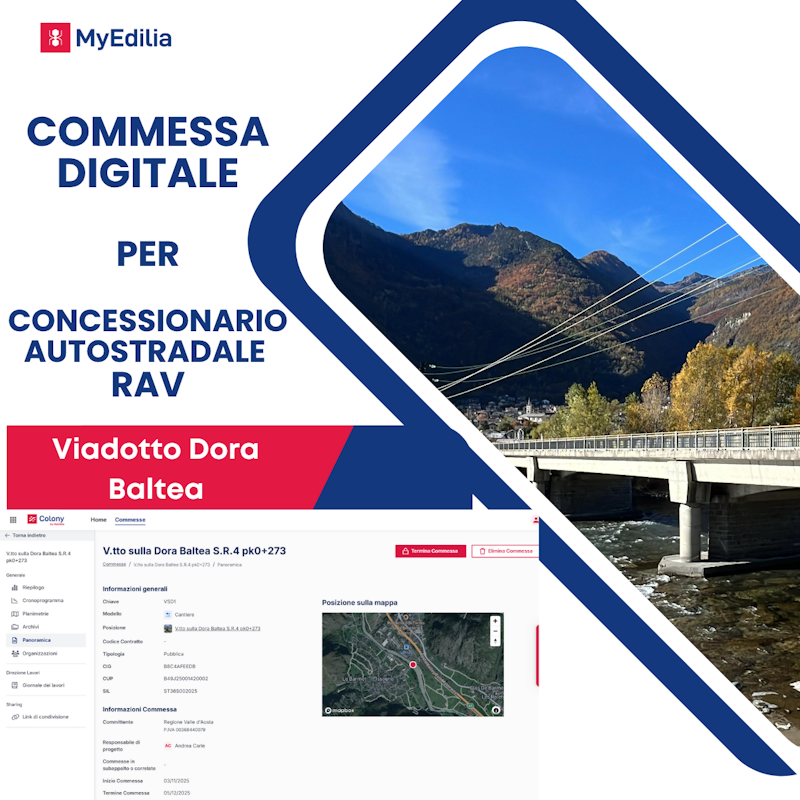 Grazie alla funzione Sharing di MyEdilia è stato possibile condividere, a fine lavori, tutto il flusso di documenti e dati alla D.L. La commessa, gestita per concessionario autostradale, ha visto imp...