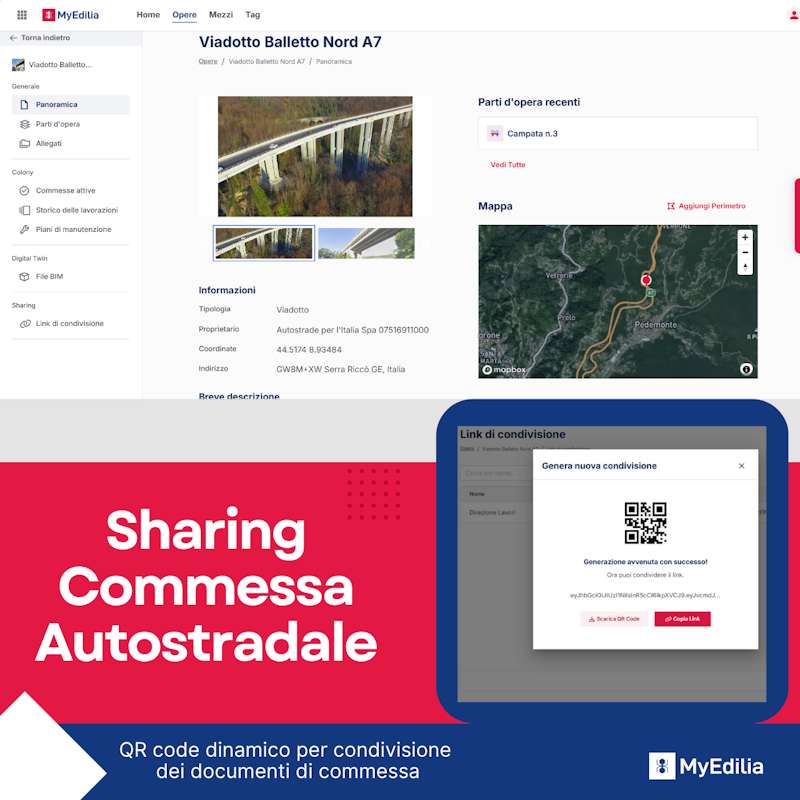 Grazie alla funzione Sharing di MyEdilia è stato possibile condividere, a fine lavori, tutto il flusso di documenti e dati alla D.L. La commessa, gestita per concessionario autostradale, ha visto im...